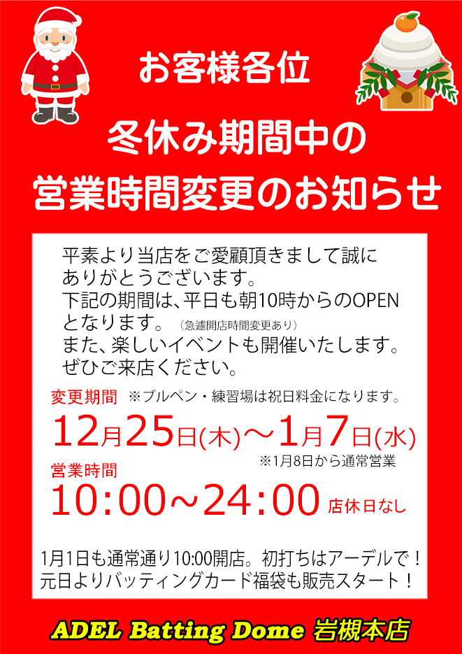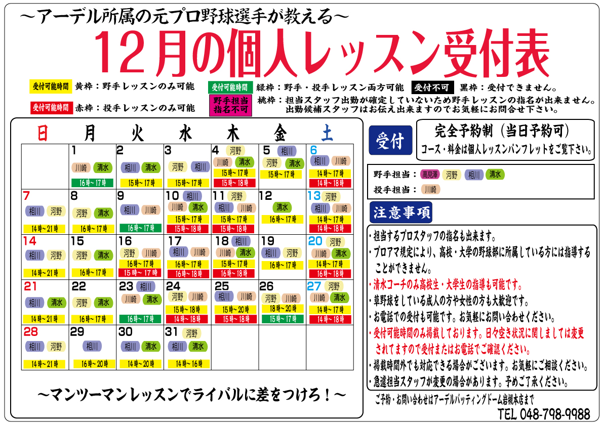 アーデルバッティングドーム12月の個人レッスン受付表になります。 清水コーチのみ高校・大学野球部所属の方も レッスン対応可能です。 詳しくはポスター参照下さい。 ご予約、お問い合わせは アーデルバッティングドームまで。 TEL048ー798−9988 |