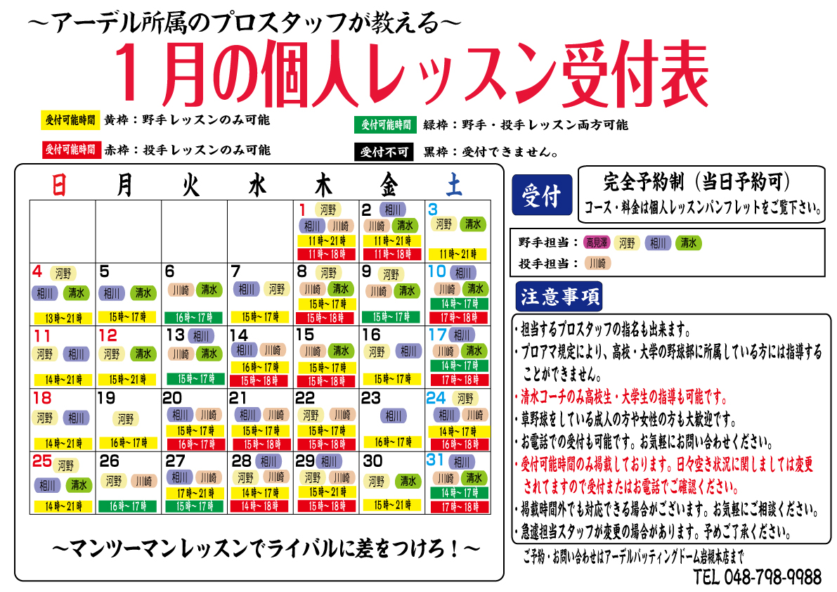 アーデルバッティングドーム1月の個人レッスン受付表になります。 清水コーチのみ高校・大学野球部所属の方も レッスン対応可能です。 詳しくはポスター参照下さい。 ご予約、お問い合わせは アーデルバッティングドームまで。 TEL048ー798−9988 |